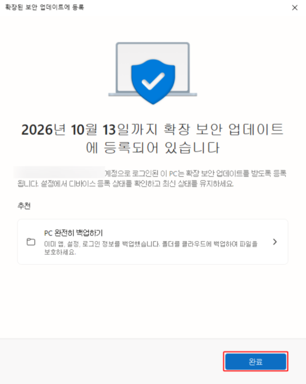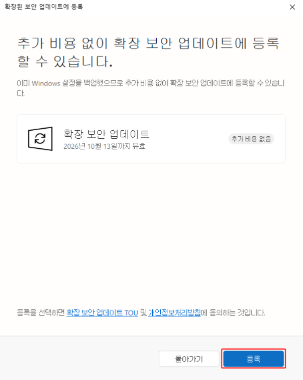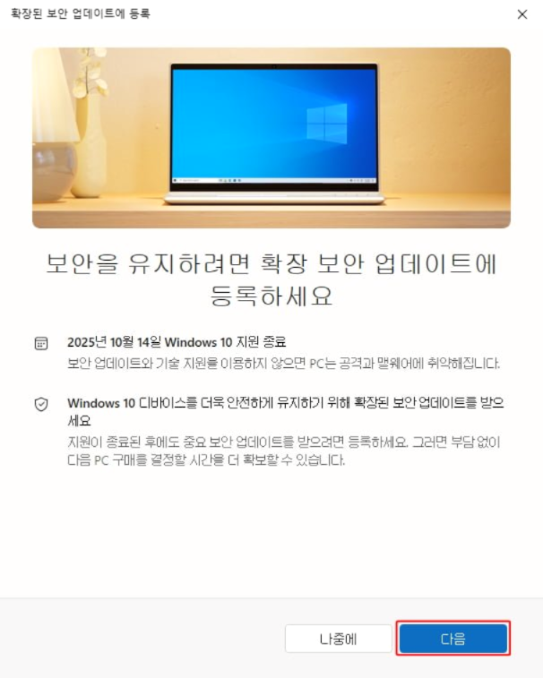 - ESU 등록: Windows 10 지원 종료 후 자동으로 안내 메시지가 뜨며, 등록 절차를 안내.